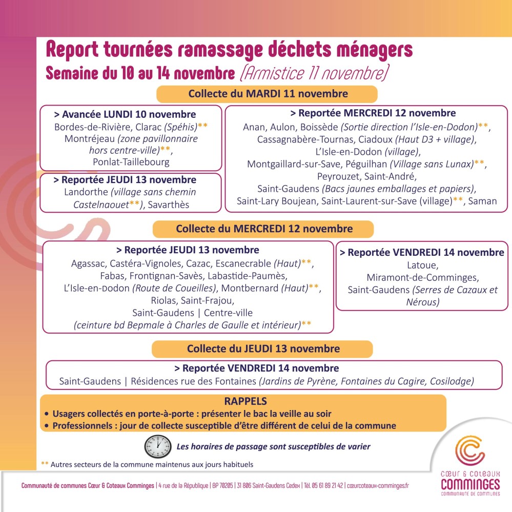 Pour cause de jour férié, le ramassage des déchets ménégers est reporté au jeudi 13 novembre 2025 (exception pour Castelnaouets)